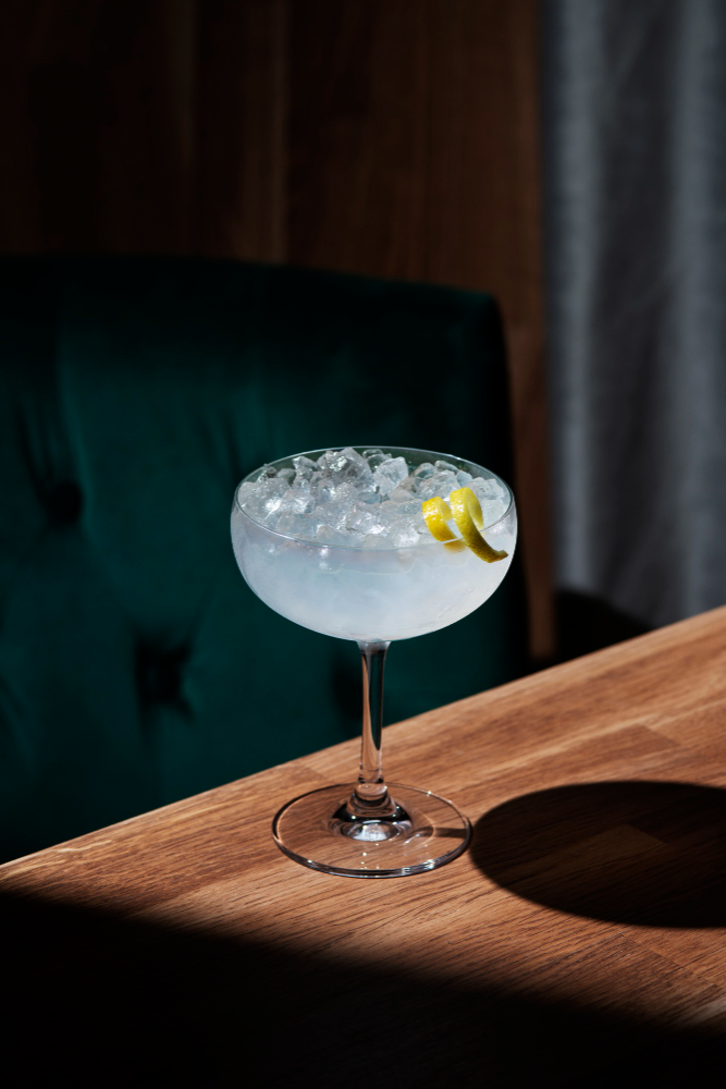 Versez dans un verre à cocktail raffiné rempli de glace pilée.