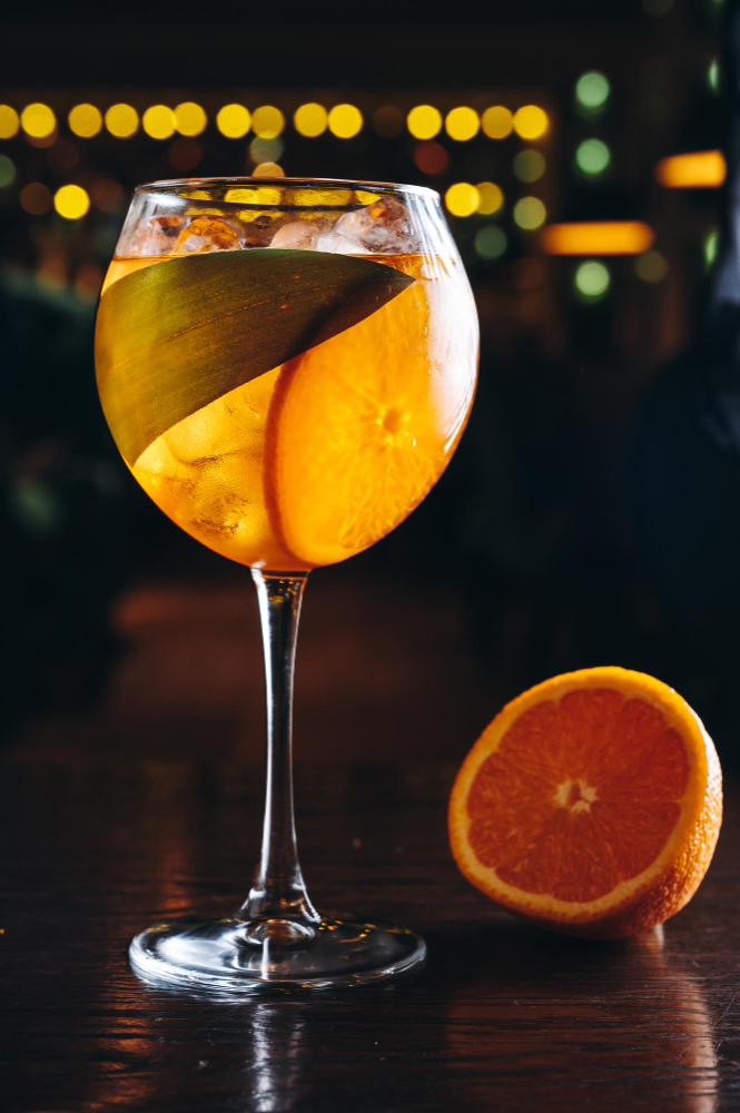 Décorez d’un zeste d’orange twisté et d’une feuille de basilic frais.