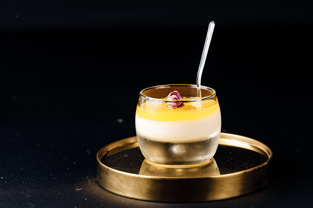 Light vanilla Bourbon panna cotta with fresh mango coulis.